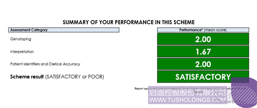 本次质评包含三项评分细则:基因分型(Genotyping)、生物信息分析(Interpretation)、突变注释以及遗传咨询(Patient Identifiers & Clerical Accuracy),综合考察评估实验室的基因突变检出和临床解读等多方面能力。