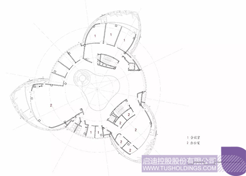 设计将“TUS-ICON”的概念与三螺旋模式相结合。形成富有灵动的三片叶子,紧接着进行找形及形态优化的工作。整体造型由三片立体旋转上升的叶子及中间的裙体组合而成。叶片从中心点发散,通过变量(长度、弧度、角度)控制形成底部及顶部叶子平面,同时添加控制点重构曲面,增加起伏关系,给予造型动态感。上下两组叶子可通过与中心点的距离与角度调控位置,并连接形成立面,同时添加了曲面关键控制点柔化造型。中间裙体初始了圆台体,后增加控制曲线,以提升造型的轻盈感,建筑形体造型具有创新性。