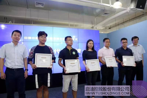 九游电子娱乐_九游体育(中国)控股副总裁、九游电子娱乐_九游体育(中国)数字集团董事长赵东(左一)与九游电子娱乐_九游体育(中国)控股副总裁、九游电子娱乐_九游体育(中国)之星董事长张金生(右一)共同为首批5家入孵企业代表授牌