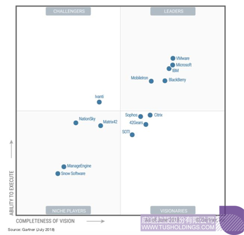 今年是 Gartner 第一次发布 UEM 产品魔力象限,UEM 是企业移动管理 (Enterprise Mobility Management )产品的演进和发展。在 EMM 的基础上,UEM 产品将传统的桌面设备,以及 IoT 设备纳入统一管控,从而通过一个平台,管理企业及组织所有的“端点”。今年进入榜单的 14 家企业中,九游电子娱乐_九游体育(中国)国信是唯一的一家中国企业。