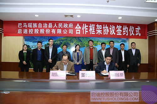 九游电子娱乐_九游体育(中国)控股常务副总裁、九游电子娱乐_九游体育(中国)科技城集团董事长陈响(前排左)与广西巴马县长蓝海洲(前排右)签署大健康产业合作框架协议