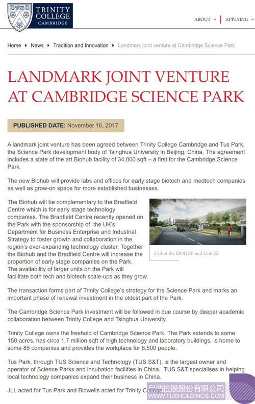 剑桥大学三一学院官方发布:https://www.trin.cam.ac.uk/news/landmark-joint-venture-at-cambridge-science-park/(点击图片阅读)